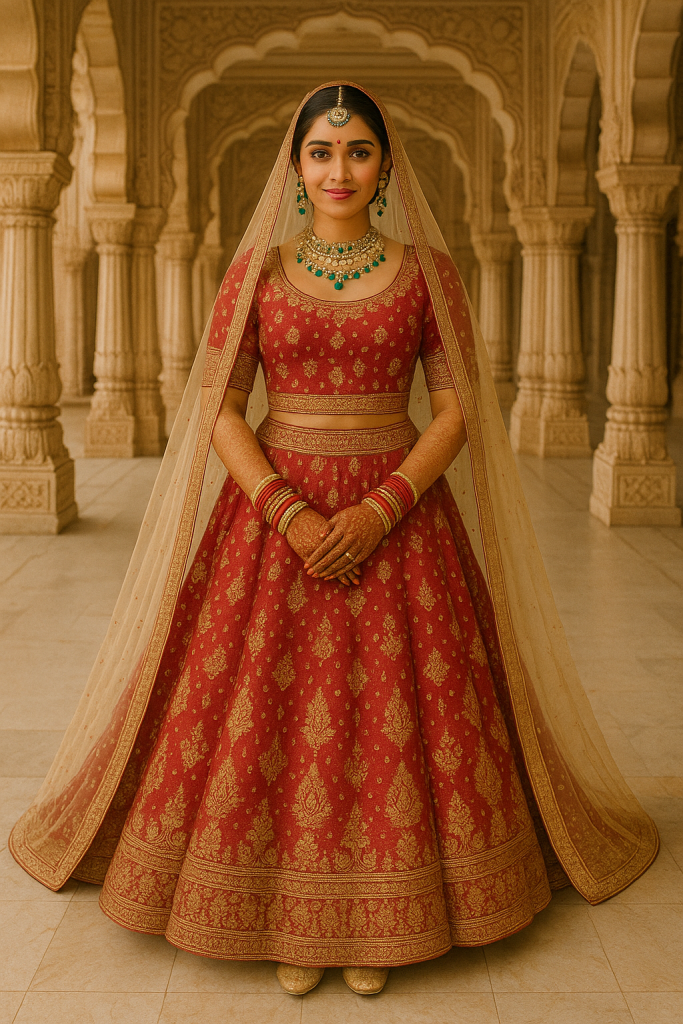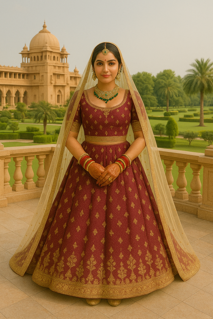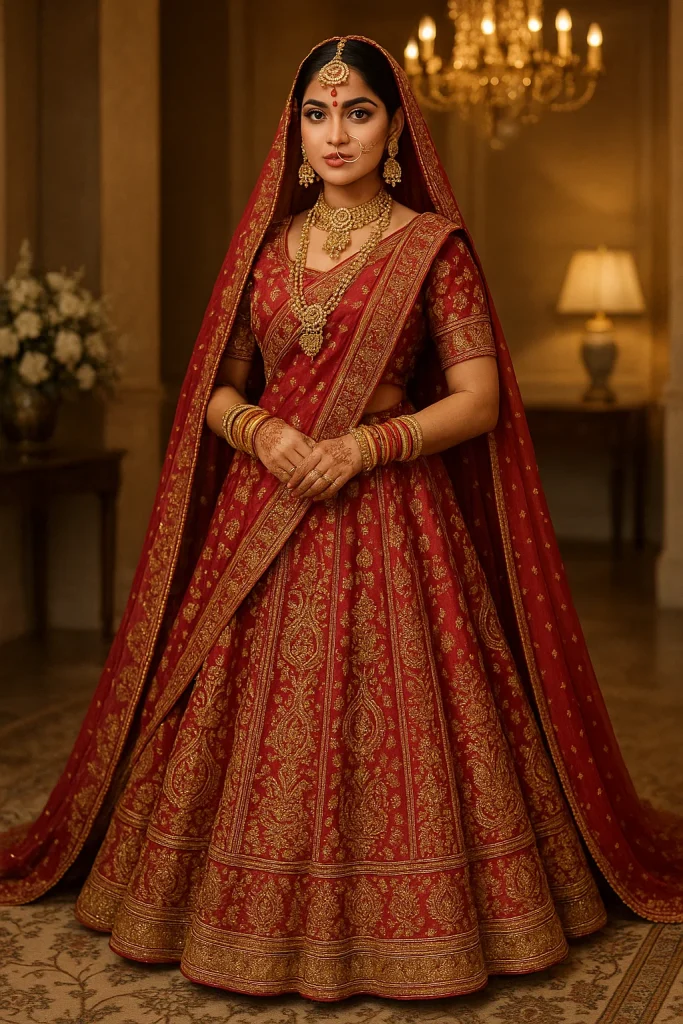 - शारीरिक बनावट (Body Type): अगर आपकी हाइट कम है, तो A-Line लहंगा आपके लिए बेहतरीन रहेगा। लंबी दुल्हनों के लिए फ्लेयर्ड लहंगे परफेक्ट होते हैं।
