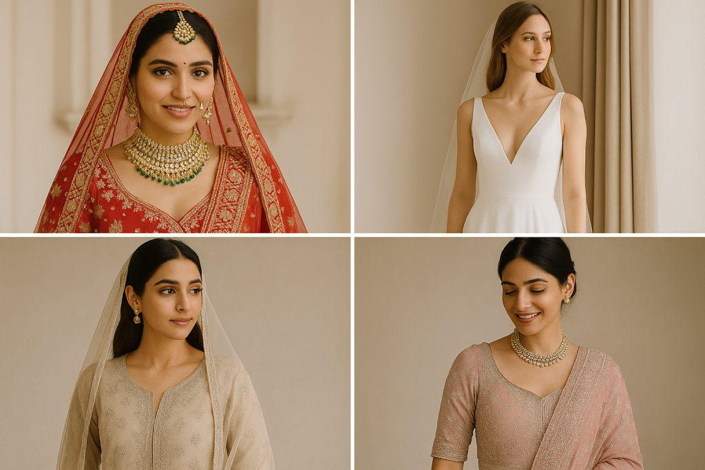 India: Rich in tradition, Indian brides often wear bright, heavily embellished sarees or lehengas in red, maroon, or gold. States like Punjab, Gujarat, and Bengal have their own distinct bridal styles.