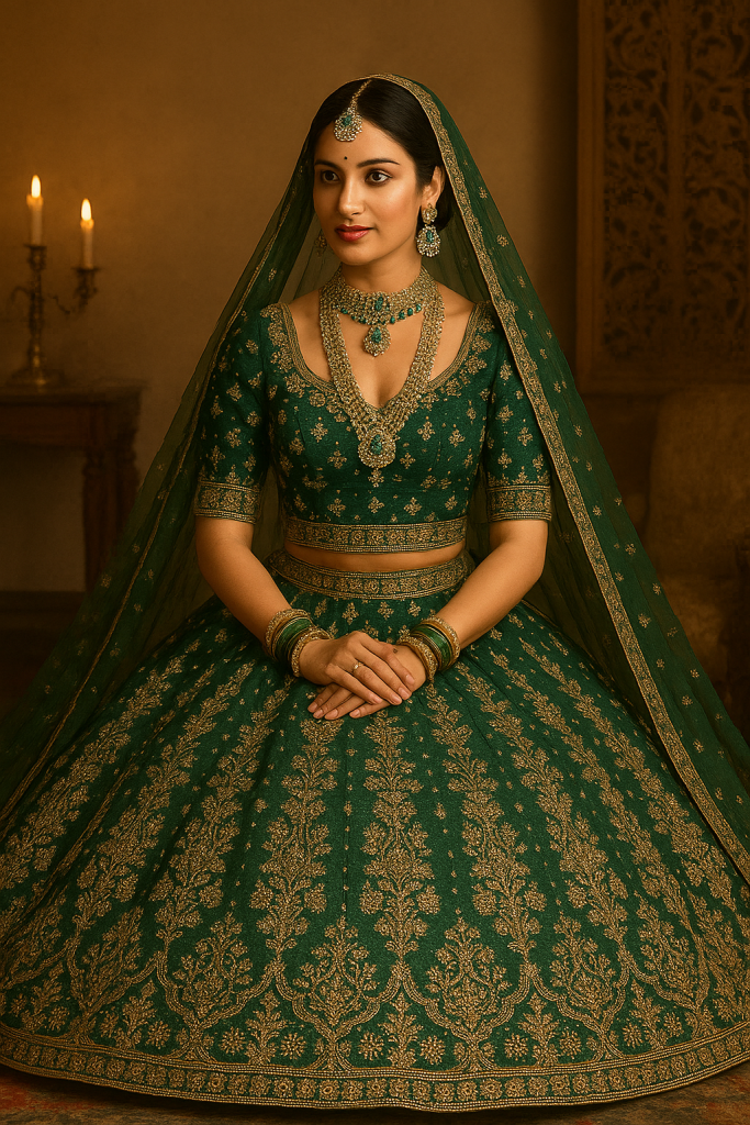 While traditional reds and maroons continue to rule Indian bridal fashion, modern brides are embracing offbeat hues like blush pink, wine, emerald green, ivory, and powder blue. Choosing the right color for your bride lehenga depends on: