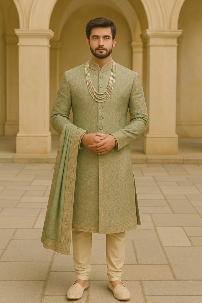 Pair your sherwani with an embroidered stole or dupatta. It adds depth and drama to your overall appearance. - Shoes Matter