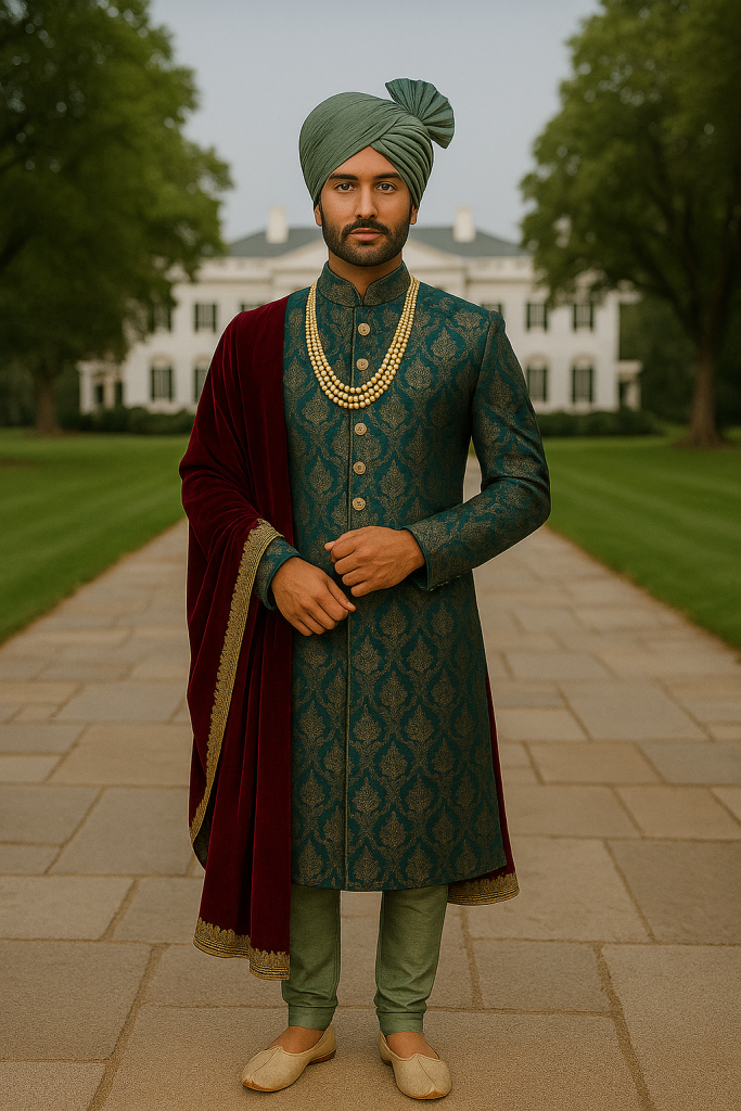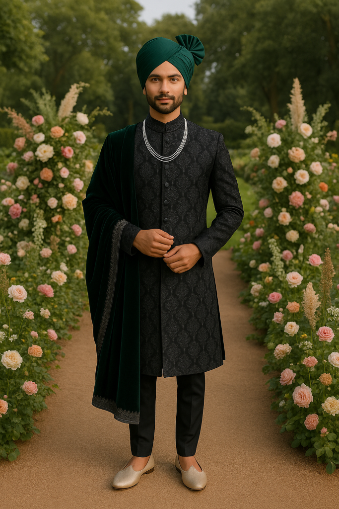 - Add a brooch, necklace (kantha), or turban ornament (kalgi) to elevate the sherwani.