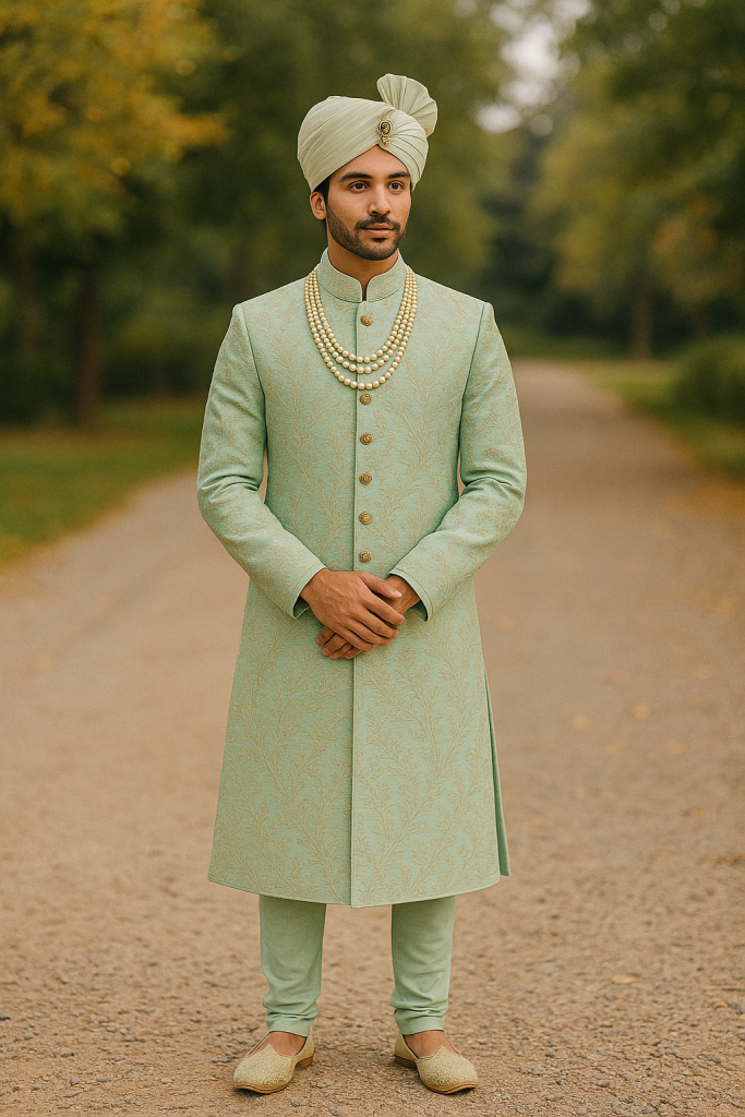 A lighter, more fitted alternative, the Achkan is often worn for daytime weddings or smaller events. It works well with floral prints, pastels, or digital embroidery.