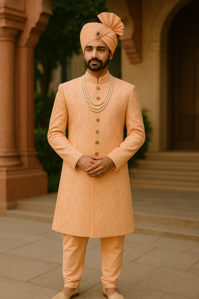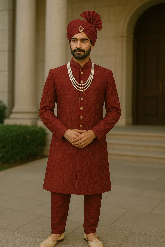 - Reception: Choose a velvet or satin sherwani with rich detailing for a regal appearance.