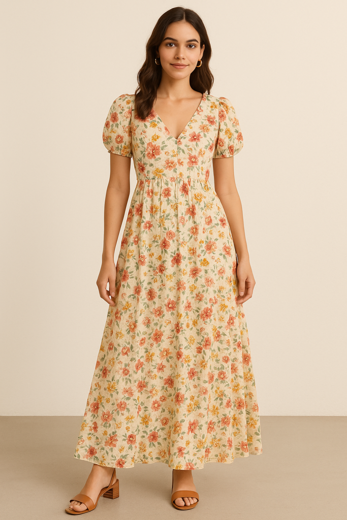 ट्रेंडिंग फैशन का नंबर वन चुनाव – फ्लोरल मैक्सी ड्रेस। हल्के कॉटन या रेयॉन फैब्रिक में बनी ये ड्रेसेस गर्मी में ठंडक देती हैं और फुल लेंथ होने के कारण बेहद एलिगेंट लगती हैं।